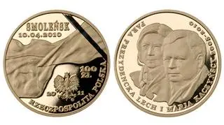 - złotą 100-złotówkę z podobizną prezydenckiej pary Lecha i Marii Kaczyńskich (ma dodatkowo naniesiony techniką tampodruku motyw czarnego kiru),