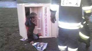 Jak się okazało, mężczyzna utknął w wąskim wrzucie, kiedy próbował wyciągnąć ubrania. By uwolnić pomysłowego 18-latka potrzebna była pomoc strażaków.