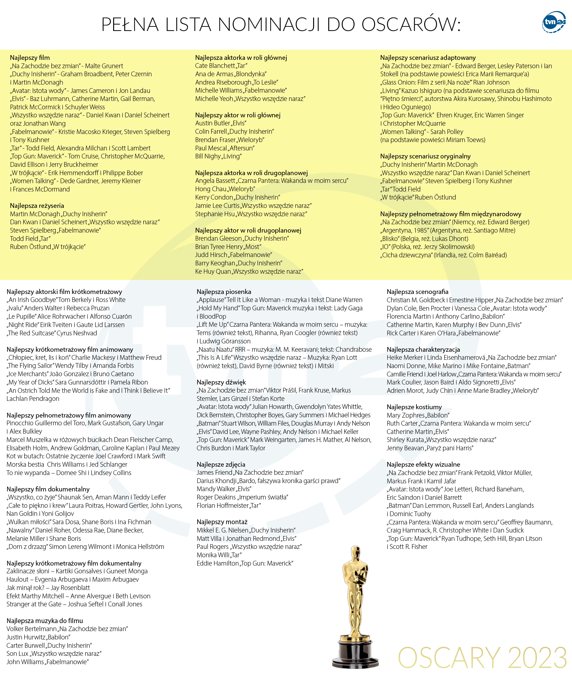 Najwięcej nominacji (11) otrzymał film "Wszystko wszędzie naraz" w reżyserii duetu "The Daniels", czyli Dana Kwana i Daniela Scheinerta. Tytuł znalazł się wśród dziesięciu kandydatów do Oscara w kategorii najlepszy film. Ponadto otrzymał jeszcze dziesięć nominacji. "Wszystko wszędzie naraz" ma mocną konkurencję w wyścigu o najważniejszą statuetkę. A są to: "Na Zachodzie bez zmian", "Avatar: Istota wody", "Duchy Inisherin", "Elvis", "Fabelmanowie", "Tar", "Top Gun: Maverick", "W trójkącie" i "Women Talking".