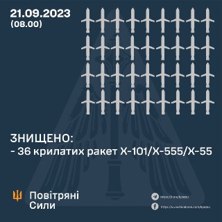 ⚡️ ЗНИЩЕНО 36 КРИЛАТИХ РАКЕТ ПОВІТРЯНОГО БАЗУВАННЯ ➖➖➖➖➖➖➖➖➖➖➖➖ Уночі 21 вересня 2023 року близько 3.40 російські окупанти атакували Україну крилатими ракетами повітряного базування Х-101/Х-555/Х-55 Усього зафіксовано пуски 🚀 43 крилатих ракет із ✈️ 10 літаків стратегічної авіації Т-95мс з району західніше Енгельса. Ракети запускали у декілька хвиль. В повітряний простір України вони входили з різних напрямків, постійно змінюючи курс по маршруту. В результаті бойової роботи силами та засобами Повітряних Сил у взаємодії із ППО Сил оборони знищено 36 крилатих ракет. До відбиття удару застосовано зенітні ракетні війська, винищувальну авіацію, Повітряних Сил, підрозділи мобільних вогневих груп Сил оборони України та інші засоби. Крім того, близько 6.00 ранку противник завдав удару зенітними керованими ракетами С-300 по Харкову. Працюють відповідні служби. Про наслідки повідомить місцева військова адміністрація. ✊ Тримаймо небо! 🇺🇦 Разом до перемоги!
