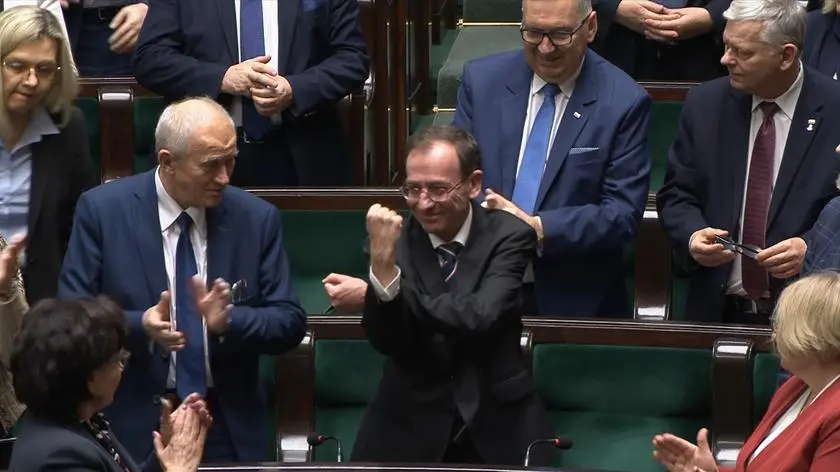 Mariusz Kamiński i Maciej Wąsik, którzy zostali skazani na dwa lata więzienia, pojawili się na sali obrad Sejmu, aby wziąć w czwartek popołudniu udział w głosowaniach. Kamiński, przy aplauzie polityków PiS, pokazał obraźliwy gest. Do wydarzeń odniósł się marszałek izby.