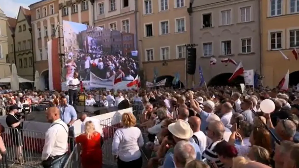 Odśpiewanie hymnu podczas wiecu Tuska w Jeleniej Górze. W tle słychać gwizdy
