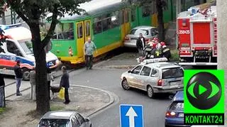 Zderzenie samochodu osobowego z tramwajem na poznańskim Grunwaldzie. Cztery osoby - w tym dziecko - trafiły do szpitala. Jak informują policjanci, nie są to jednak poważne obrażenia. Zdjęcia z miejsca, w którym doszło do wypadku zamieściła w serwisie Kontaktu 24 Reporterka 24, gosik.