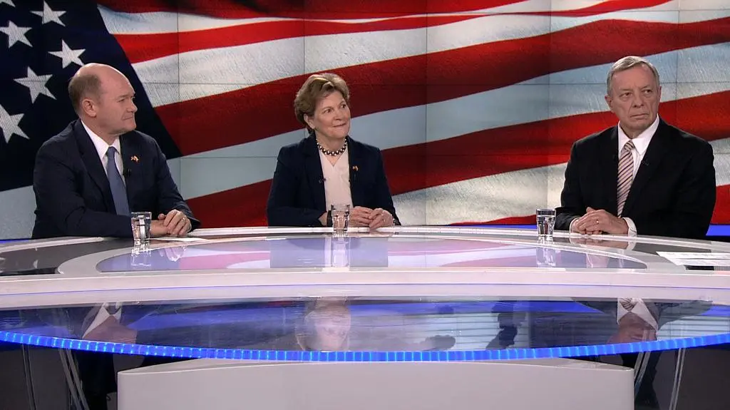 Następnie amerykańscy senatorowie rozmawiali z Piotrem Kraśką. W studiu TVN24 obecni byli senator Christopher Coons z komisji spraw zagranicznych, senator Richard Durbin, rzecznik dyscypliny większości w Senacie oraz senator Jeanne Shaheen z komisji obrony.