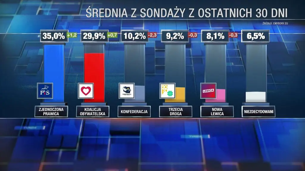 W Sejmie znalazłyby się jeszcze dwa ugrupowania - Trzecia Droga z poparciem 9,2 procent oraz Lewica z wynikiem 8,1 procent. 6,5 procent ankietowanych - wynika ze średniej sondażowej - jest niezdecydowanych.