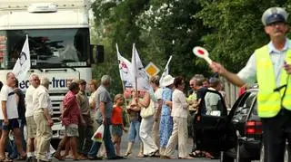 Protestujący, ekolodzy i mieszkańcy Strzelna, utrudniają ruch samochodów ciągle przechodząc przez przejścia dla pieszych. Protest ma potrwać godzinę.