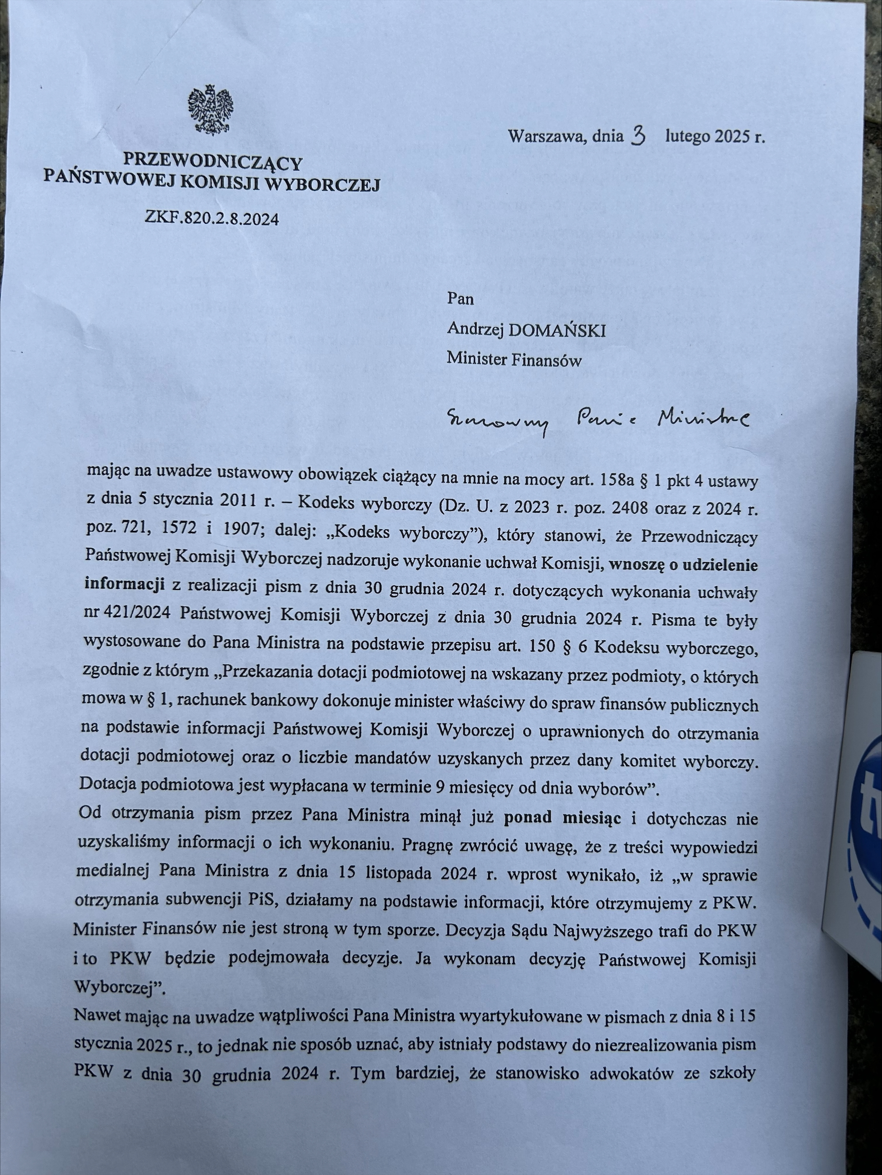Po poniedziałkowym posiedzeniu PKW jej szef Sylwester Marciniak poinformował, że Komisja nie była w stanie przedstawić ministrowi finansów wykładni swojej uchwały. Jak wyjaśnił, z trzech propozycji wykładni żadna nie uzyskała większości, w związku z czym wszystkie trzy trafią do ministra Domańskiego. Szef PKW poinformował ponadto, że skierował do ministra finansów własne pismo, w którym zwrócił się o informację na temat wykonania przelewów finansowych dla PiS w związku z przyjęciem przez Komisję sprawozdania finansowego komitetu wyborczego tej partii z wyborów parlamentarnych 2023 roku.