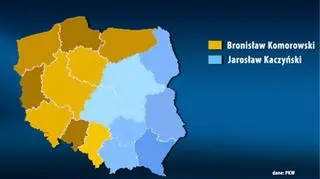 Kandydat Platformy Obywatelskiej uzyskał największe poparcie w województwach: pomorskim (52,64 proc.), opolskim (51,62 proc) i lubuskim (51,09 proc.). Prezes Prawa i Sprawiedliwości mógł liczyć na najwięcej głosów wyborców w regionach: podkarpackim (54,92), lubelskim (48,75 proc.), małopolskim (45,89 proc).
