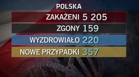 Z danych Ministerstwa Zdrowia wynika, że w środę potwierdzono obecność koronawirusa u 205 osób. Łącznie w Polsce potwierdzono 5205 przypadków zakażenia. Wyzdrowiało 222 osób.
