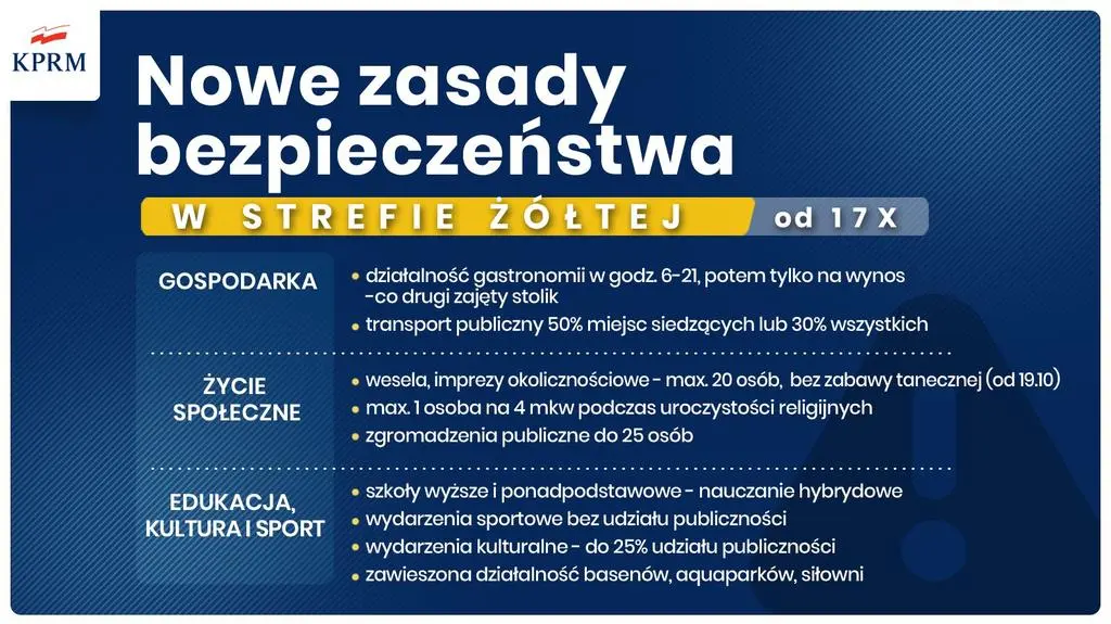 Działalność gastronomii w godzinach 6-21, potem tylko na wynos; zgromadzenia do 25 osób; nauczanie hybrydowe w szkołach średnich i wyższych; zawieszenie działalności basenów, aquaparków i siłowni - to między innymi nowe obostrzenia w strefie żółtej.