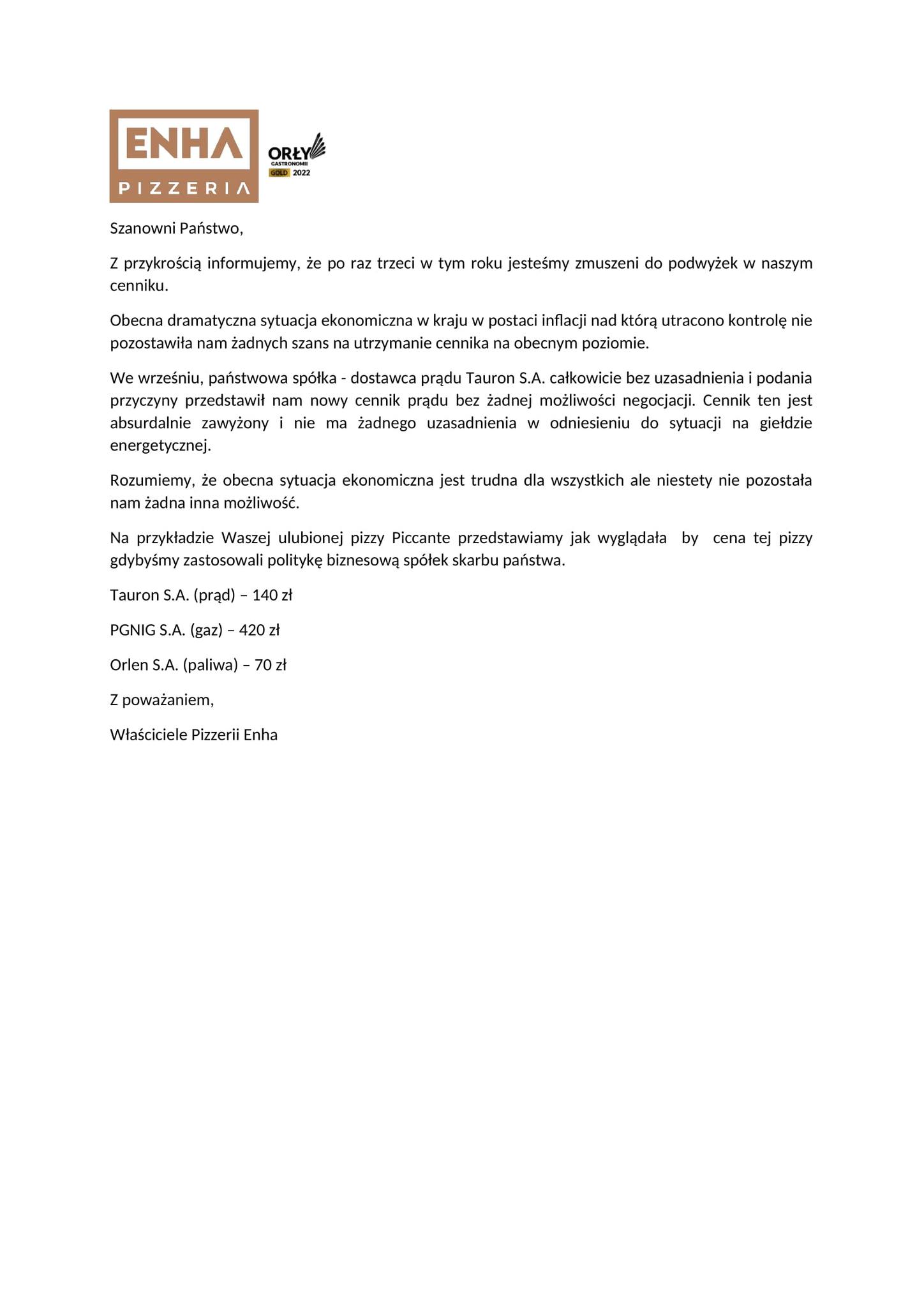 "Na przykładzie waszej ulubionej pizzy Piccante przedstawiamy, jak wyglądałaby cena tej pizzy, gdybyśmy zastosowali politykę biznesową spółek skarbu państwa" - czytamy. Według właścicieli lokalu cena mogłaby - zamiast 35 złotych - wynieść 70 złotych (gdyby zastosować podwyżkę, jaką Orlen wprowadził na paliwa), 140 złotych (w przypadku ceny prądu) lub nawet 420 złotych (porównując do oferty PGNiG, dostawcy gazu).