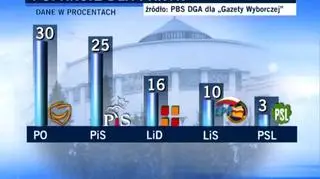W ciągu dwóch tygodni od poprzedniego sondażu zmieniło się niewiele. Prowadzi Platforma Obywatelska (30 proc., 1 punkt proc. w dół) przed Prawem i Sprawiedliwością (25 proc., punkt w górę). Najlepszy wynik - jak do tej pory - osiągnął blok Lewica i Demokraci (16 proc.).