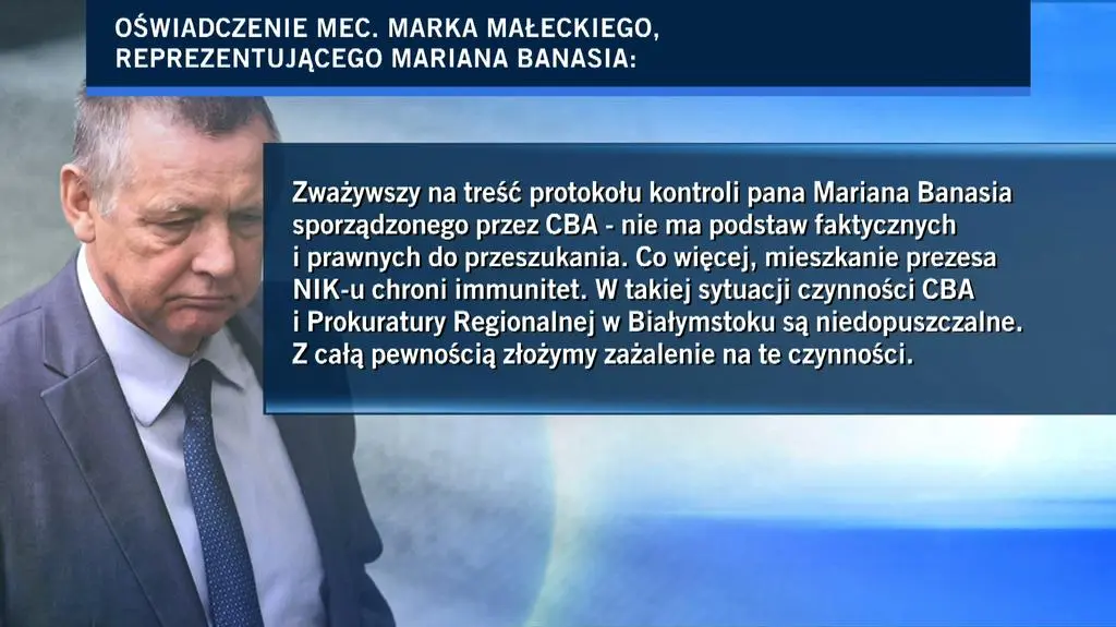 Do sprawy przeszukań w mieszkaniach Mariana Banasia odniósł się w środę rano jego pełnomocnik, adwokat Marek Małecki. - Składamy zażalenie na czynność przeszukania mieszkania pana prezesa NIK Mariana Banasia. Nie ma podstaw faktycznych i prawnych do tej czynności - przekazał tvn24.pl mecenas Małecki.