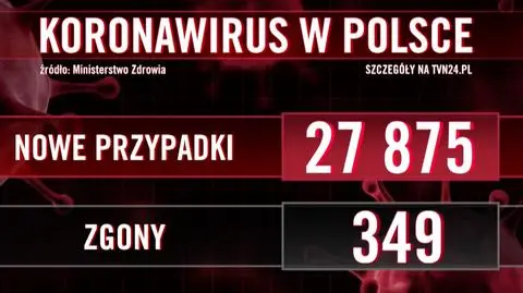 W sobotę Ministerstwo Zdrowia poinformowało o najwyższej od początku pandemii liczbie nowych zakażeń koronawirusem: 27 875. Zmarło 349 chorych. Od początku pandemii zachorowało ponad pół miliona osób, a zmarło 7,6 tysiąca.