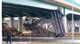 Do niecodziennego zdarzenia doszło w piątek rano na jednej ze stołecznych ulic. Kierowca ciężarówki nie zamknął wywrotki i nie zmieścił się pod wiaduktem.