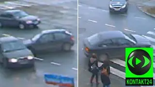 Poranne godziny szczytu, warszawskie Bemowo, skrzyżowanie ulic Powstańców Śląskich i Człuchowskiej. Zamontowana na strychu kamera uchwyciła moment zderzenia dwóch samochodów, z których jeden, o mały włos, nie potrącił pieszych na chodniku. Nagranie zamieścił w serwisie Kontaktu 24 @zejman.