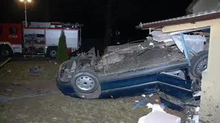 Rozpędzone auto wypadło z drogi, przeleciało przez rów, przebiło się przez ogrodzenie posesji i dachując uderzyło w ganek oddalonego 15 metrów od drogi domu.