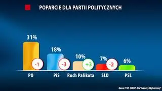 I tak: Na Platformę Obywatelską chce zagłosować 31 proc. (spadek o 1 pkt. proc), a na Prawo i Sprawiedliwość - 18 proc. (spadek o 3 pkt. proc.). Ruch Palikota cieszy się poparciem 10 proc. respondentów (wzrost o 3 pkt. proc.). Sojusz Lewicy Demokratycznej może liczyć zaś 7 proc. (spadek o 2 pkt. proc.). Tuż nad progiem znajduje się PSL z 6 procentowym poparciem.
