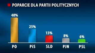 Z sondażu wynika, że wybory wygrałaby Platforma Obywatelska - na partię Donalda Tuska swój głos chciałoby oddać 40 proc. ankietowanych. Drugą największą partią w Sejmie byłoby Prawo i Sprawiedliwość z poparciem 25 proc. wyborców. 13 proc. respondentów zadeklarowało chęć głosowania na Sojusz Lewicy Demokratycznej.