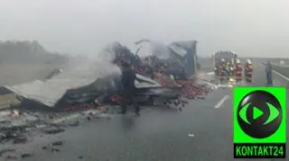 Na autostradzie A4, między węzłem Przylesie a Prądy, spłonęła naczepa przewożąca owoce. Kierowcy jadący w kierunku Katowic przez kilka godzin musieli liczyć się z utrudnieniami. Zdjęcia z miejsca zdarzenia zamieścił na swoim profilu w Kontakcie 24 serwis 24opole.pl oraz internauta Grzegorz.