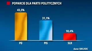 Według najnowszego sondażu partyjnego SMG/KRC dzisiaj miejsce w parlamencie znalazłyby tylko trzy partie. Gdyby wybory odbyły się w najbliższą niedzielę, wygrałaby je Platforma Obywatelska - chęć oddania głosu na partię Donalda Tuska deklaruje 43,5 proc. ankietowanych (wzrost o 3,5 punktu procentowego w porównaniu do 15 czerwca). Największa partia opozycyjna - Prawo i Sprawiedliwość - mogłoby liczyć na 31,1 proc. poparcia. W czerwcu na PiS głosować chciało 32 proc. respondentów.