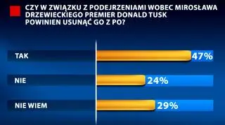 Zdjęcie (): 626001Zdjęcie (): 626005Na pytanie "A czy w związku podejrzeniami wobec Zbigniewa Chlebowskiego premier Donald Tusk powinien usunąć go z Platformy Obywatelskiej" 55 proc. ankietowanych odpowiedział "tak", przeciwnego zdania było tylko 22 proc. ankietowanych. Dokładnie tyle samo ankietowanych nie miało zdania na ten temat. Odwołania Ministra Drzewieckiego chce 47 proc. ankietowanych, 24 proc. staje w obronie ministra sportu a 29 proc. nie ma zdania.