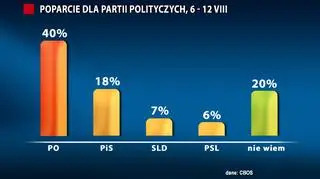 PO, SLD i PSL mają poparcie takie samo jak w ubiegłym miesiącu: na partię Donalda Tuska chce głosować 40 proc. Polaków, na SLD - 7 proc., na PSL - 6 proc. Poparcie dla PiS w porównaniu z lipcem zmniejszyło się o 2 pkt proc. i wynosi 18 proc.