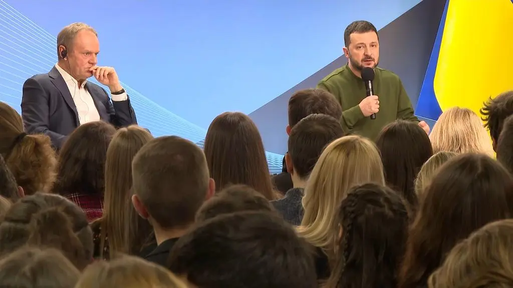 Tusk z Zełenskim wzięli także w poniedziałek udział w spotkaniu ze studentami. Polski premier mówił, że "znajdziemy w Europie sposób na to i nad tym w tej chwili pracujemy, żeby Europa z (Viktorem) Orbanem, czy bez Orbana, jednoznacznie wspierała Ukrainę zarówno w procesie integracji Ukrainy z Unią Europejską, jak i bezpośredniej, doraźnej pomocy w czasie wojny, pomocy materialnej, politycznej, militarnej".
