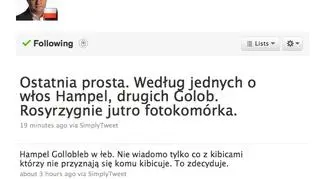Adam Hoffman też się mocno zaangażował w komentowanie żużla. „Hampel od 4 do 8 długości motocykla przed Golobem” – to około 16. Godzinę później: „Hampel Gollob łeb w łeb. Nie wiadomo tylko co z kibicami którzy nie przyznają się komu kibicuje. To zdecyduje.”, a tuż przed 19.: „Ostatnia prosta. Według jednych o włos Hampel, drugich Golob. Rozstrzygnie jutro fotokomórka.”