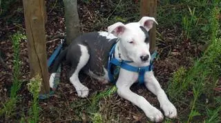 Uratowany szczeniak to suczka, mieszaniec Stafforda. Jak przekonują pracownicy firmy, piesek był przywiązany do drzewa w miejscu tak mało uczęszczanym, że odnalezienie go przez nich to czysty przypadek.