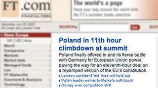 "FT" na swej stronie internetowej pisze, że w sobotę w nocy "Polska ostatecznie zgodziła się zakończyć ostry spór z Niemcami o wpływy w Unii Europejskiej, umożliwiając w ten sposób zawarcie w dosłownie ostatnim momencie porozumienia w sprawie zmienionej wersji konstytucji europejskiej" - mandatu, stanowiącego projekt nowego traktatu UE.