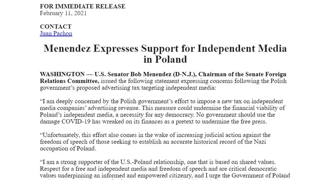 W czwartek oświadczenie w tej sprawie wydał amerykański senator Bob Menendez, przewodniczący senackiej Komisji Spraw Zagranicznych. "Jestem głęboko zaniepokojony staraniami polskiego rządu o nałożenie nowego podatku na dochody z reklam niezależnych firm medialnych" – napisał senator Partii Demokratycznej. "Wzywam rząd Polski do wykazania szacunku dla wolnej prasy poprzez ponowne rozważenie tej inicjatywy" – zaapelował.