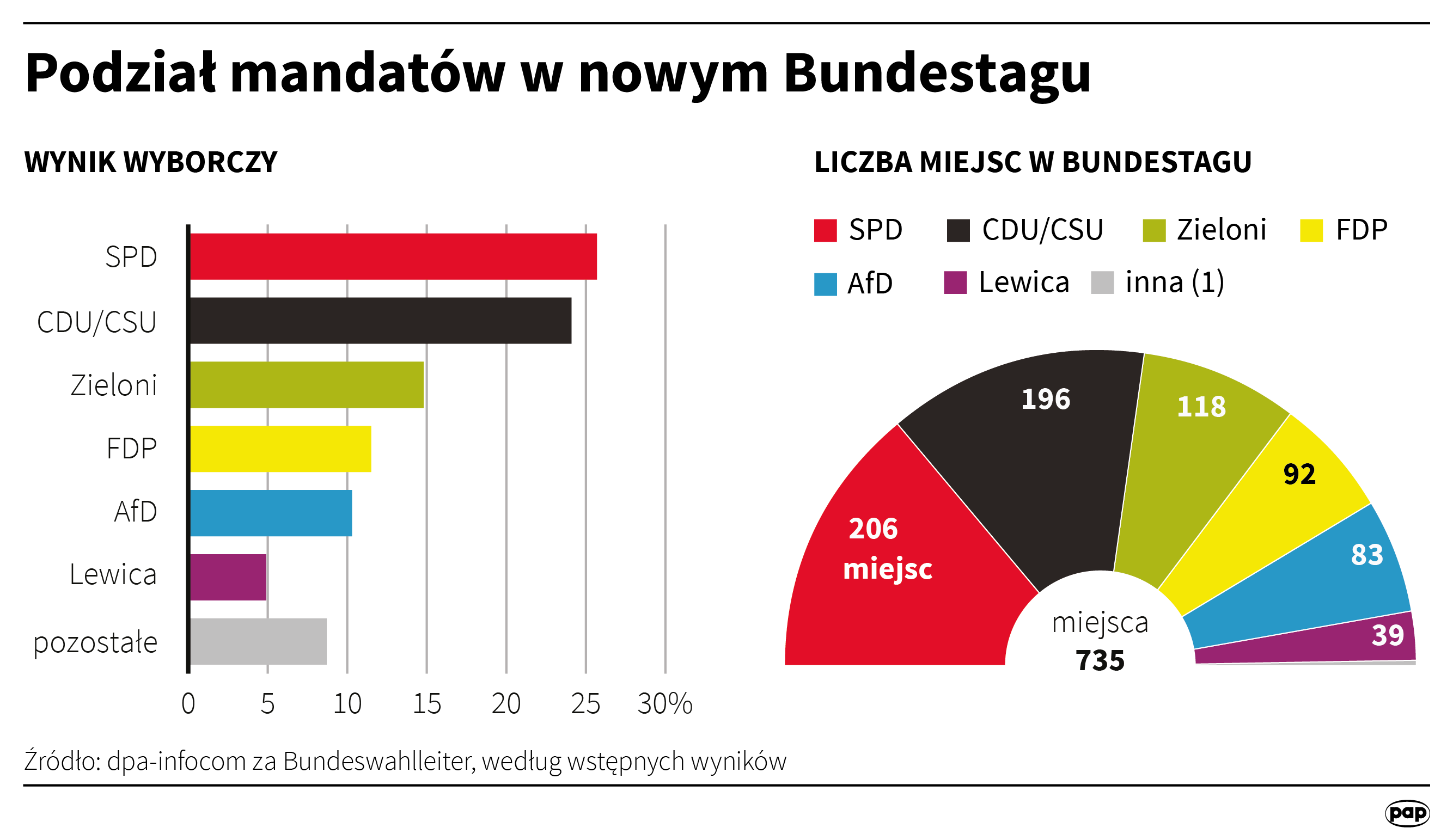 Przed tygodniem w wyborach do Bundestagu najsilniejszą partią okazała się SPD z wynikiem 25,7 procent. Unia CDU/CSU spadła do historycznie najniższego poziomu 24,1 procent, ale nie zrezygnowała z możliwości utworzenia rządu. Na trzecim miejscu uplasowali się Zieloni z 14,8 procent, a za nimi FDP z 11,5 procent. AfD uzyskała 10,3 procent głosów.
