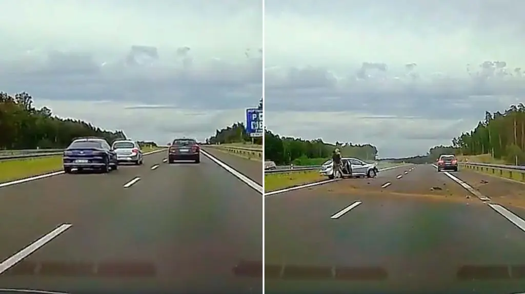 Seat, którym jechał z żoną i czteroletnim synem, kilkukrotnie uderzył w bariery energochłonne, auto zostało zniszczone. Mężczyzna wysiadł z pojazdu, apelował do innych kierowców: "Gońcie go, błagam". Potem apelował o wskazanie sprawcy także w mediach społecznościowych.