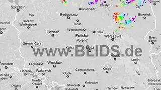 Blids.de: mapa prezentuje wyładowania atmosferyczne w czasie dwóch godzin. Każdy kolor odpowiada 15 minutom. Od najnowszych: czerwone - pomarańczowe - żółte - zielone - niebieskie - granatowe - fioletowe - różowe.