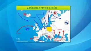 Zimne powietrze z północy coraz śmielej wdziera się w głąb kontynentu, w tym także do Polski (w nocy z soboty na niedzielę w Zamościu temperatura przy gruncie spadła do -6 stopni). Sprzyja temu układ ciśnienia nad Europą - wyż znajduje się nieco na zachód od Wielkiej Brytanii, a niże przesuwają się północą kontynentu "wysyłając" stamtąd kolejne dawki chłodu do centrum Europy. Taka cyrkulacja powietrza będzie się utrzymywać, z małymi wyjątkami, również przez następne dni (patrz mapa).