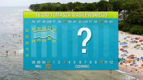 W ciągu kilku najbliższych dni czeka nas gorąca, a nawet upalna pogoda - na zachodzie i południu kraju może być aż 30-31 stopni. Taka temperatura utrzyma się do końca maja, a na początku czerwca będzie tylko o kilka stopni mniej - do 27-28 stopni. Przez następne dni możemy spodziewać się ciepłej pogody z temperaturą w zakresie od 21-22 stopni na północy do 26-27 na południu. Wyraźnie chłodniej na kilka dni może się zrobić dopiero 9 czerwca.Następna prognoza 16-dniowa w najbliższą niedzielę.