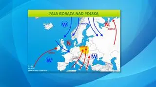 W weekend wszyscy odetchnęliśmy chłodniejszym powietrzem, które napłynęło do nas po rekordowych (tego lata) upałach. Ten odpoczynek od wysokiej temperatury będzie jednak czasami przerywany upalnymi dniami, bo na początku tygodnia dotrze do Polski nowa fala gorącego (ale nie aż tak bardzo jak ostatnio) powietrza zwrotnikowego, czyli z północnej części Afryki. Jego kolejne wtargnięcie w tym miesiącu do naszej części Europy będzie możliwe z powodu obecności niżu na zachodzie Europy i wyżu na wschód od Polski. Takie położenie układów ciśnienia stworzy idealne warunki do "importu" gorącego powietrza z południa na północ (patrz mapa).