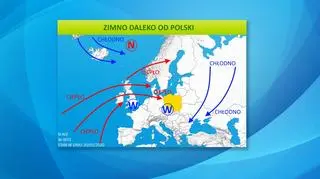 To sprawia, że utrzymuje się zachodnia cyrkulacja powietrza, czyli trwa transport ciepła znad Oceanu Atlantyckiego w nasze strony Europy. Z prognoz wynika, że taki układ sił, to znaczy niże na północy, a wyże na południu będzie się w dalszym ciągu utrzymywać, a to na razie wyklucza zimową pogodę (patrz mapa).