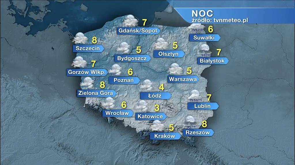 W nocy będzie pochmurnie z rozpogodzeniami. Na krańcach wschodnich kraju popada słaby deszcz o sumie do pięciu litrów wody na metr kwadratowy. Miejscami pojawią się mgły i zamglenia, szczególnie na wschodzie Polski. Temperatura minimalna wyniesie od 3 stopni Celsjusza na Górnym Śląsku, przez 4 st. C w centrum kraju, do 8 st. C na Wybrzeżu, Pomorzu Zachodnim i Ziemi Lubuskiej. Wiatr powieje z kierunków południowych, będzie słaby i umiarkowany.