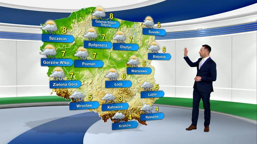 Pogoda na jutro zapowiada się pochmurno z przejaśnieniami, postępującymi od północy w głąb kraju. Pojawią się także przelotne opady deszczu do 1-5 litrów wody na metr kwadratowy, które przemieszczać się będą z północy na południe. Temperatura maksymalna sięgnie od 3 stopni Celsjusza na Górnym Śląsku, przez 6 st. C w centrum kraju, do 8 st. C na Pomorzu. Zachodni i północno-zachodni wiatr będzie dość silny, a w porywach rozpędzi się do 60-90 km/h.