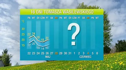 Na początku tygodnia będzie więc ciepło, ale temperatura już nie przekroczy 24 stopni. Później, w trakcie tygodnia, z północy napłynie chłodniejsze powietrze i czekają nas zimniejsze dni z temperaturą od 14 do 20 stopni. Cieplej zrobi się ponownie pod koniec maja i na początku czerwca. Wtedy na termometrach zobaczymy powyżej 20 stopni, a przez moment nawet 28 st. C. Po tym wyraźnym i chwilowym ociepleniu temperatura wróci na wiosenne tory i będzie przeważnie od 16 do 22 stopni.