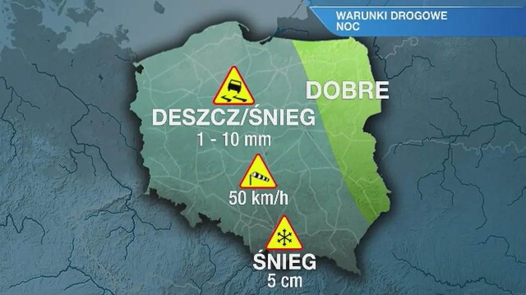 Na obszarach położonych powyżej 600 m n.p.m. mogą wystąpić opady śniegu, miejscami o natężeniu umiarkowanym. Prognozowany przyrost pokrywy śnieżnej wyniesie 5 do 7 cm, lokalnie do 10 cm. Prawdopodobieństwo wystąpienia wynosi 80 proc. Ostrzeżenie obowiązuje od godziny 10 do 22.