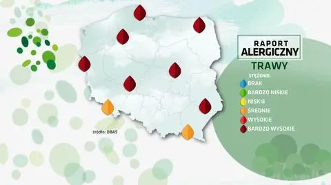 Na przeważającym obszarze kraju - poza Polską południowo-wschodnią - występuje bardzo wysokie stężenie pyłków traw. Wzrasta też stężenie zarodników grzybów mikrosporowych - Alternaria i Cladosporium.