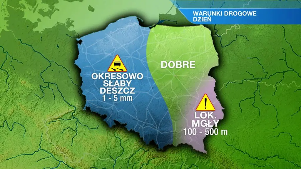 W piątek warunki na drogach okażą się trudne w zachodniej połowie Polski, gdzie prognozuje się słabe opady deszczu. Na południowym wchodzie pojawią się lokalne mgły. W pozostałych regionach aura będzie sprzyjać podróżującym.