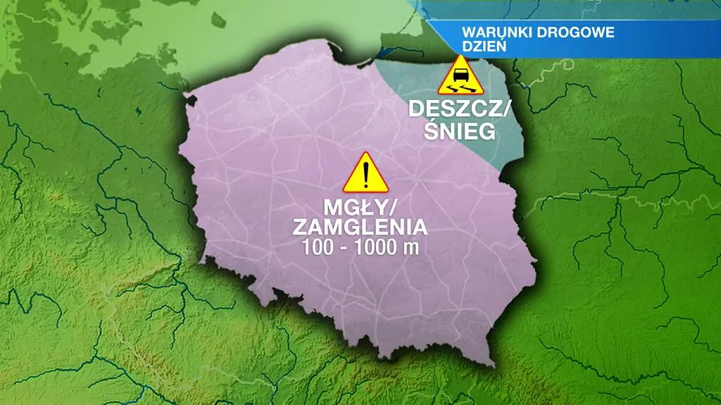 W ciągu dnia w przeważającej części kraju warunki na drogach będą utrudnione przez mgły i zamglenia. Widzialność będzie ograniczona od 100 do 1000 metrów. Tylko na północnym wschodzie synoptycy prognozują opady deszczu ze śniegiem.