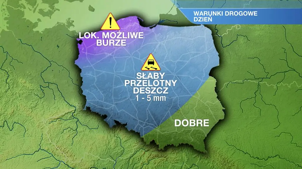 W sobotę w centralnej części kraju prognozowane są słabe, przelotne opady deszczu rzędu 1-5 litrów wody na metr kwadratowy. W pasie Wybrzeża mogą wystąpić lokalne burze. Jedynie w południowo-wschodniej Polsce utrzymają się dobre warunki drogowe.