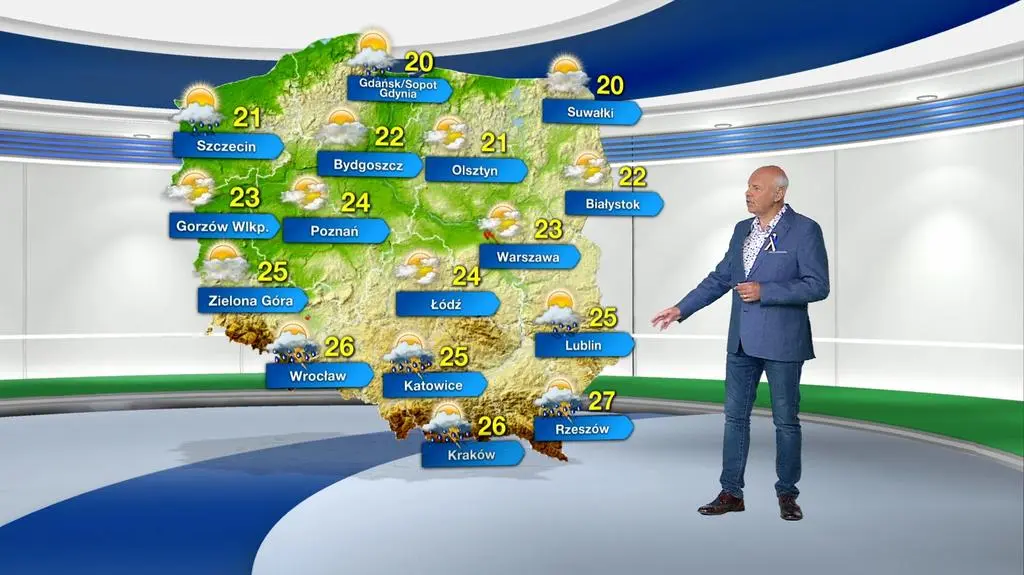 W czwartek na niebie spodziewane jest małe i umiarkowane zachmurzenie, jedynie na Pomorzu i południu kraju okresami duże. Mogą pojawić się przelotne opady deszczu do 5-20 l/mkw., a w górach i na przedgórzu - burze. Na termometrach zobaczymy maksymalnie od 20 st. C na Suwalszczyźnie i Kaszubach, przez 24 st. C w centrum kraju, do 27 st. C na Podkarpaciu. Północno-zachodni i zachodni wiatr powieje słabo i umiarkowanie, ale okresami - szczególnie w burzach - może być dość silny i w porywach rozpędzać się do 50-60 kilometrów na godzinę.