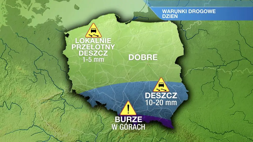 Na przeważającym obszarze kraju dzień przyniesie pochmurną aurę z przejaśnieniami, a nawet chwilowymi rozpogodzeniami. Jedynie na południu i południowym wschodzie kraju mogą wystąpić opady deszczu rzędu 10-20 litrów wody na metr kwadratowy, a w górach spodziewane są burze. Od Ziemi Lubuskiej, przez Pomorze, po Warmię i Mazury oraz częściowo Podlasie mogą pojawić się także przelotne opady do 1-5 l/mkw.
