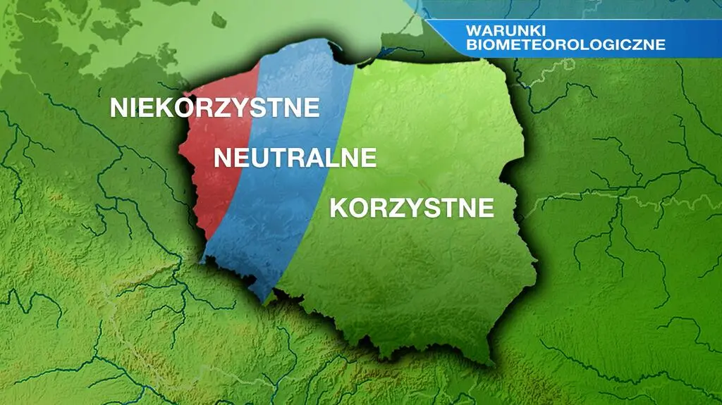 Wilgotność powietrza w ciągu dnia wahać się będzie od 40 do 90 procent. Warunki biometeorologiczne przeważnie okażą się korzystne, tylko na zachodzie przechodzące w neutralne i niekorzystne.
